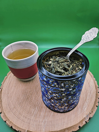 Ingrédients : thé vert de Chine, arômes de fraise, rhubarbe, fleur d’oranger, cerise, datte et figue, ananas, raisin, mangue bleuet, fleurs de souci.