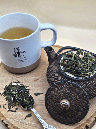 Ingrédients : thé vert* de Chine, Inde et Japon, gingembre*, pétales de rose*, arômes naturels de figue de barbarie, fraise, grenade, passion et fruit du dragon, fleur d’oranger*.